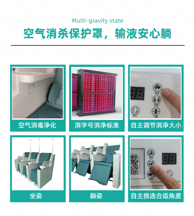 • 舒适度升级:除了空气净化,椅身还支持无级多角度调节,多重气囊按摩模式,搭配USB充电、手机支架等,让输液不再"煎熬";